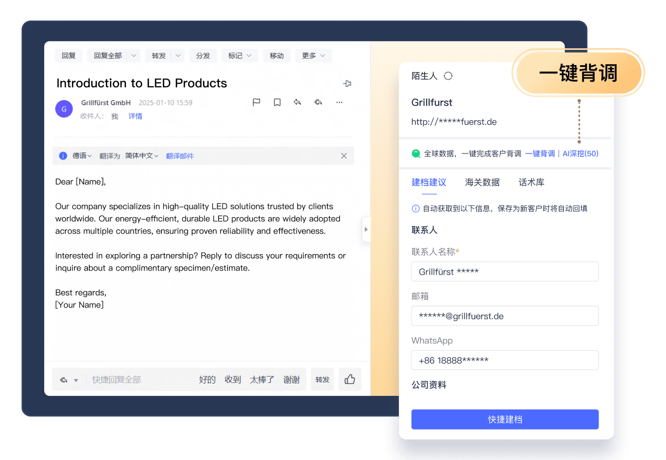 阅读客户来信时可快速查看往来邮件了解沟通历史,使用客户面板优先跟进重点客户。